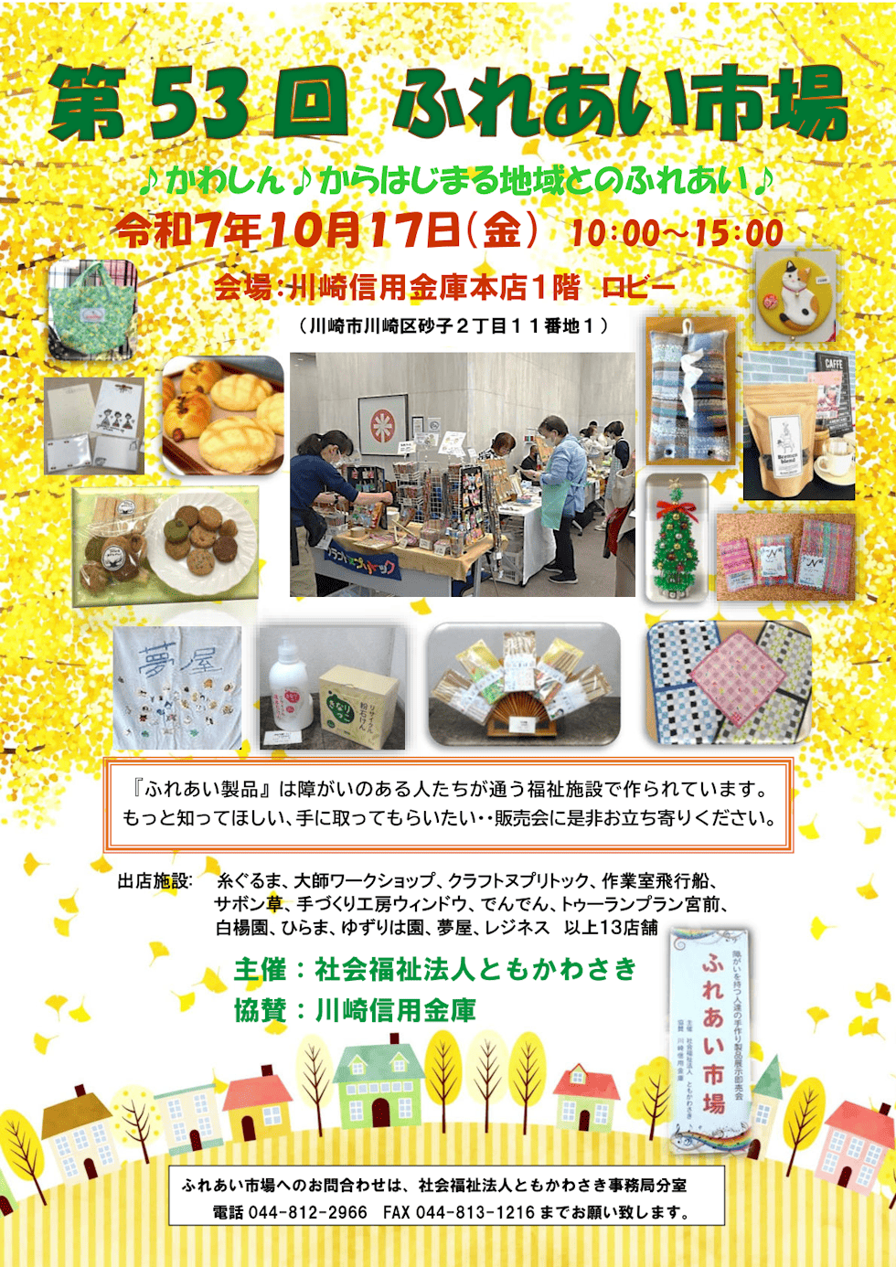 第53回ふれあい市場@川崎信用金庫本店(令和7年10月17日) 2025年10月17日 最終更新日時 : 2026年3月13日 sek-hr7 ♪かわしん♪からはじまる地域とのふれあい♪ 『ふれあい製品』は障がいのある人たちが通う福祉施設で作られています。もっと知ってほしい、手に取ってもらいたい・・・販売会に是非お立ち寄りください。 イベント概要 開催日時:令和7年(2025)10月17日(金)10:00〜15:00 会場:川崎信用金庫本店1階ロビー 出店施設 糸ぐるま、大師ワークショップ、クラフトヌプリトック、作業室飛行船、サボン草、手づくり工房ウィンドウ、でんでん、トゥーランプラン宮前、白楊園、ひらま、ゆずりは園、夢屋、レジネス 以上13店舗