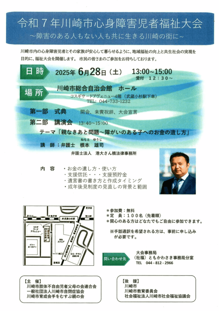 開催! 令和7年川崎市心身障害児者福祉大会 2025年6月28日 最終更新日時 : 2026年3月24日 umi@catalog 💡せっかくの「お知らせ」ですので、記事は多い方が良い・・・という視点で、こちらも年に1回、インフォメーションする候補として。カテゴリーは「トピックス」。 イベント概要 開催日:令和7年(2025)6月28日(土) 時間:13:00~15:00 会場:川崎市総合自治会館 ホール 令和7年 川崎市心身障害児者福祉大会~障害のある人もない人も共に生きる川崎の街に~ 川崎市内の心身障害児者とその家族が安心して暮らせるように、地域福祉の向上と共生社会の実現を目的に、福祉大会を開催します。皆さまのご参加をお待ちしています。 第1部式典(開会・来賓祝辞・大会宣言)講演会「親なきあと問題~障がいのある子へのお金の遺し方」 第2部(午後1時40分から3時)講師:弁護士 根本 雄司 (ねもと ゆうじ)(弁護士法人 港大さん橋法律事務所) ●お金の遺し方、使い方●支援信託・・・支援預貯金●遺言書の書き方と作成タイミング●成年後見制度の見直しの背景と範囲