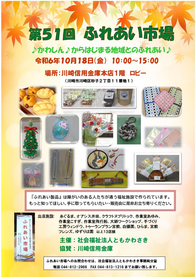 第51回ふれあい市場@川崎信用金庫本店(令和6年10月18日) 2024年10月18日 最終更新日時 : 2026年3月13日 sek-hr7 ♪かわしん♪からはじまる地域とのふれあい♪ 『ふれあい製品』は障がいのある人たちが通う福祉施設で作られています。もっと知ってほしい、手に取ってもらいたい・・・販売会に是非お立ち寄りください。 イベント概要 開催日時:令和6年(2024)10月18日(金)10:00〜15:00 会場:川崎信用金庫本店1階ロビー 出店施設 糸ぐるま、オアシス井田、クラフトヌプリトック、作業室あゆみ、作業室こすぎ、作業室飛行船、、大師ワークショップ、手づくり工房ウィンドウ、トゥーランプラン宮前、白白楊園、ひらま、宮前フレンズ、ゆずりは園 以上13店舗